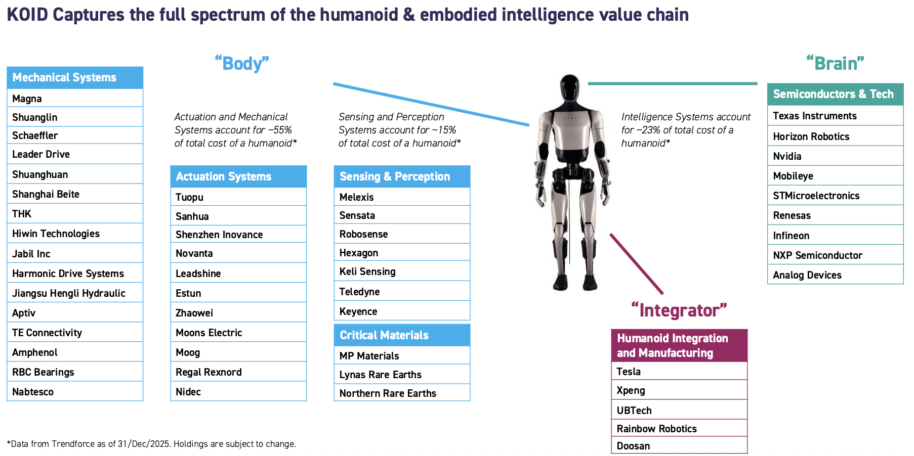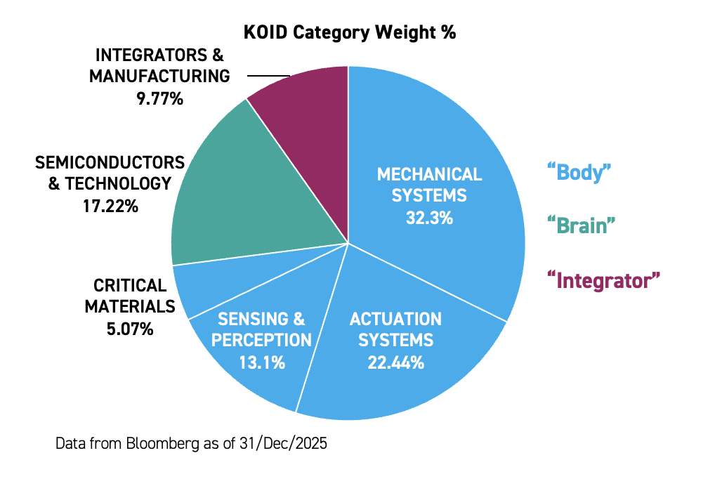 KOID provides differentiated exposure across the humanoid value chain—integrators bringing robots to market, intelligence platforms enabling interaction, data infrastructure training models, and component manufacturers shaping cost and reliability. CES reinforced that this framework reflects how the industry is already organising itself.