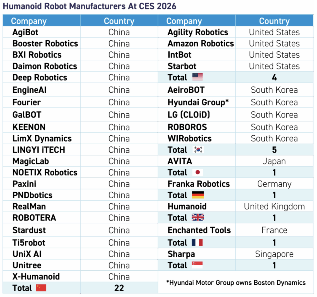 Walking the halls of CES, I encountered dozens of new humanoid robot brands—alongside component manufacturers, data-collection platforms, operating systems, and embodied-intelligence software providers. One thing quickly became obvious: the epicentre of this ecosystem is China. As seen in the chart below, many humanoid exhibitors either came directly from China or were founded by Chinese engineers now operating in Silicon Valley or elsewhere. Mandarin was spoken as frequently as English. I believe this may be a sign of an improving geopolitical atmosphere, as management teams were eyeing the US market and were enthusiastic about their future business prospects here.